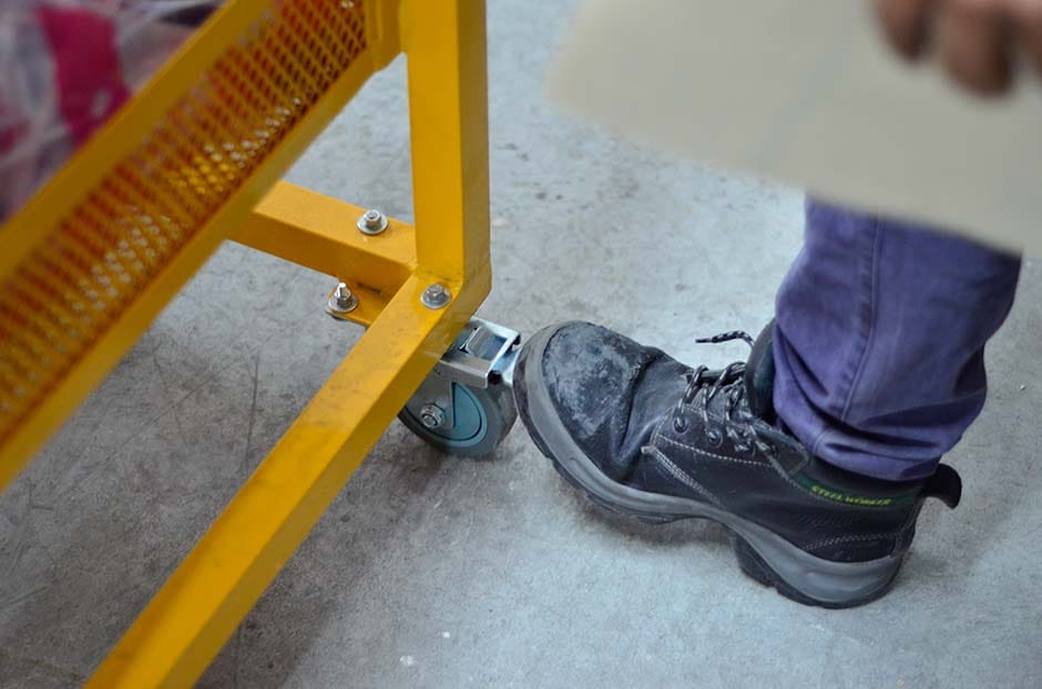 Estructura en acero soldado con gran capacidad de carga y durabilidad, cuenta con una superficie de 53 cm de ancho x 100 cm de largo que permite el almacenamiento de material de trabajo, capacidad de 350 kg, escaleras seguras que permiten llegar a cualquier lugar de las estanterías. Ruedas en poliuretano, dos fijas y dos giratorias.